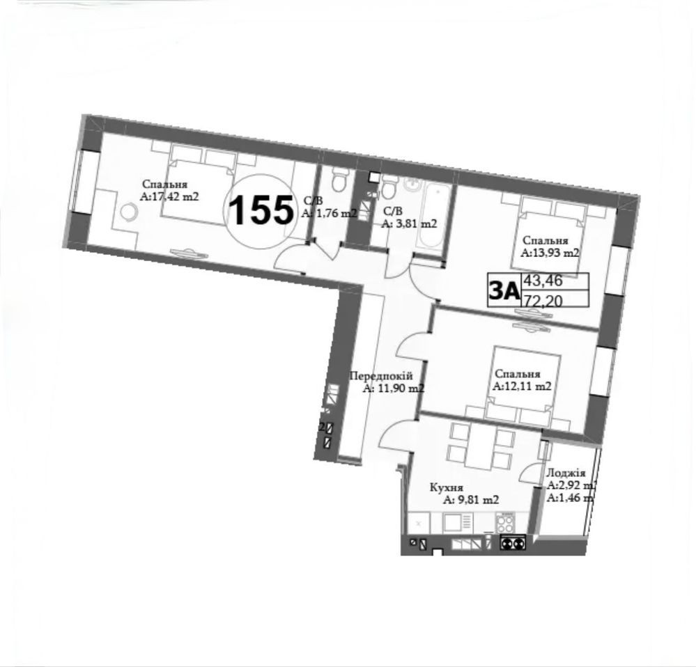 Повноцінна трикімнатна квартира зручного планування.