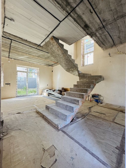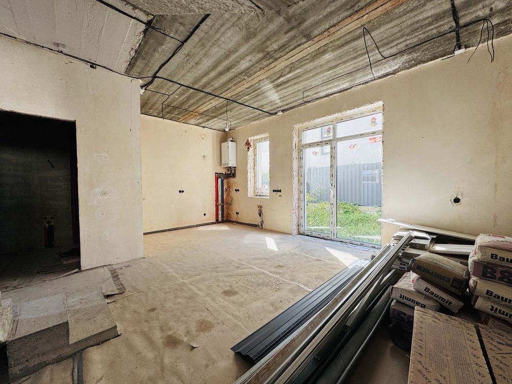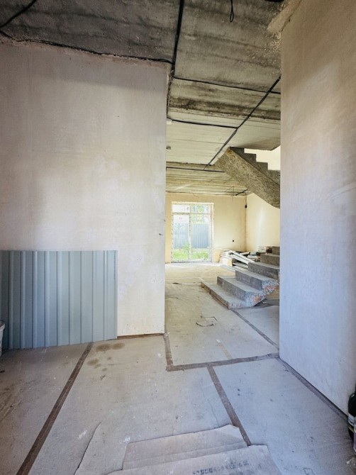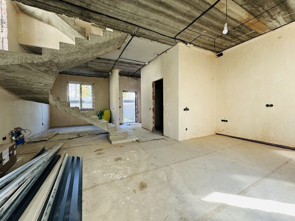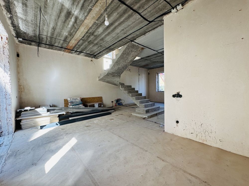 Зроблена стажка, штукатурка, проводка, розводка опаленнія і каналізації, встановелений газрвий котел, покладена поиска на підлозі першого поверху, в санвузлах покладена плитка встановлені інсталяції.