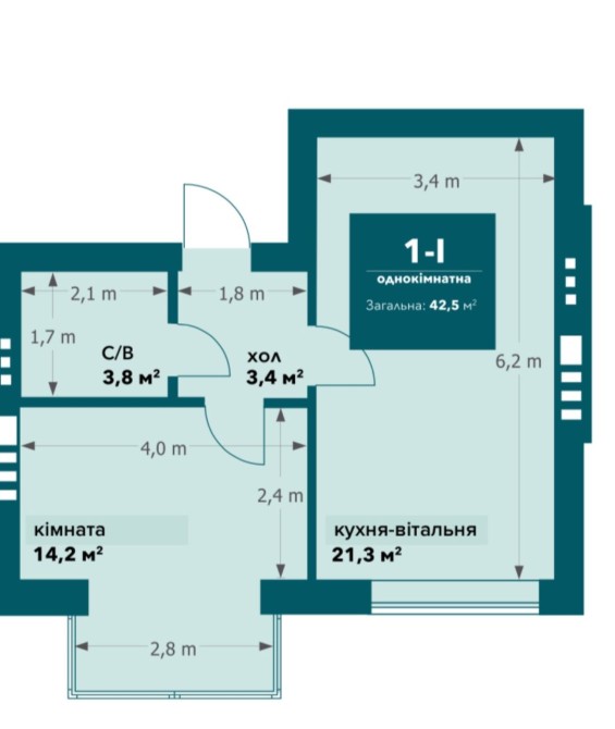 • Общая площадь 42.5 м2