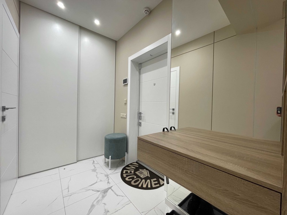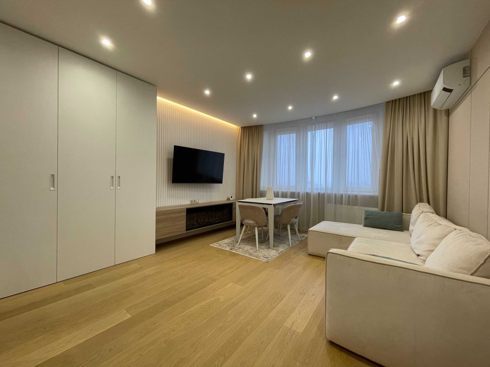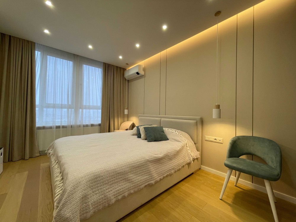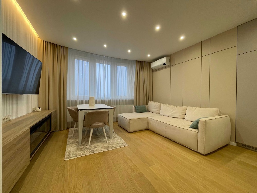 2 кімнатна сучасна квартира 68,4 кв.м з дизайнерським ремонтом в новому будинку Дарницький район, вулиця Пасхаліна 17, ЖК Новодарницький. Розташована на 16 поверсі 25 поверхового будинку 2018 року.