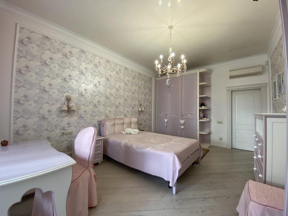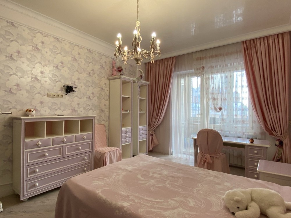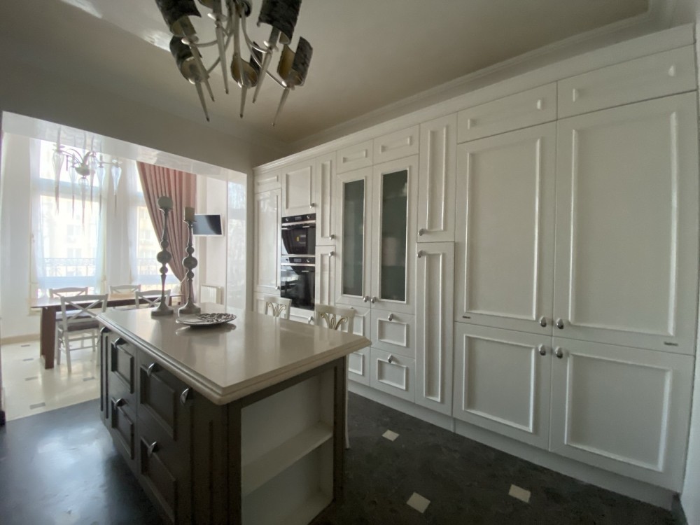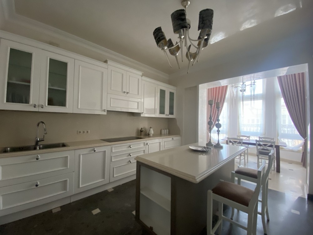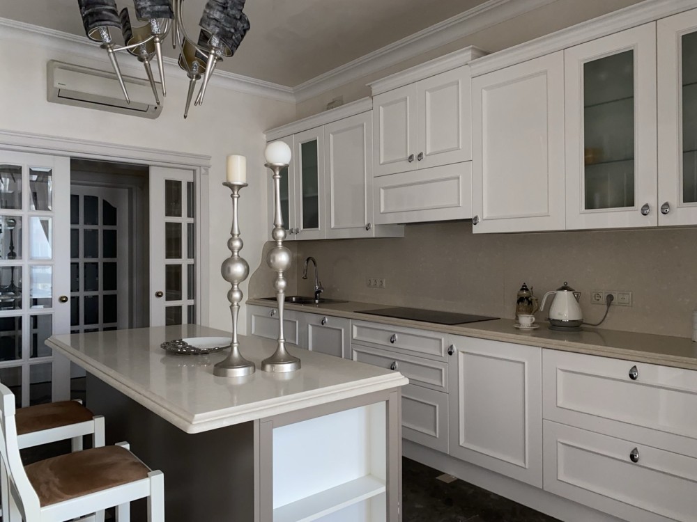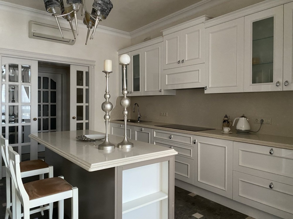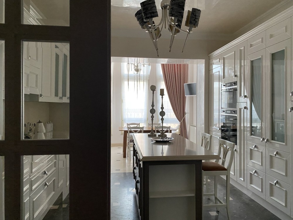 Ремонт виконано в світлих тонах: італійська мармурова підлога з підігрівом в поєднанні з паркетною дошкою, деревяні склопакети, нержавіюча система опалення, італійські меблі, техніка Smeg, дизайнерські люстри - закохують з першого погляду.
