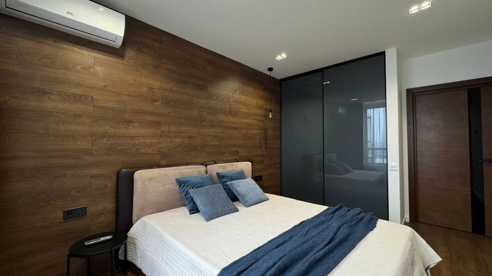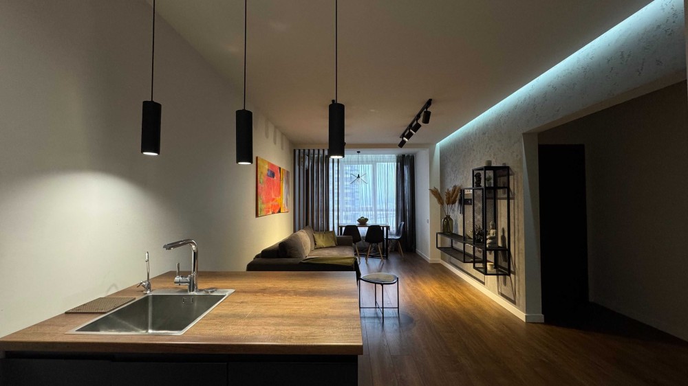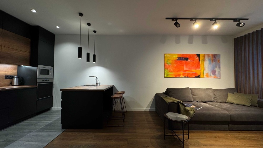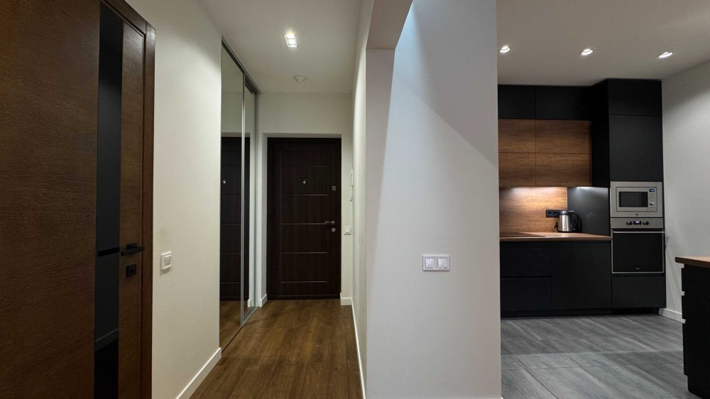 • простора кухня-вітальня, окрема спальня з гардеробною, санвузол, підсобне приміщення, балкон;