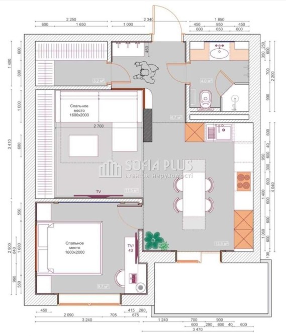 • Площадь кухни 13.8 м2
