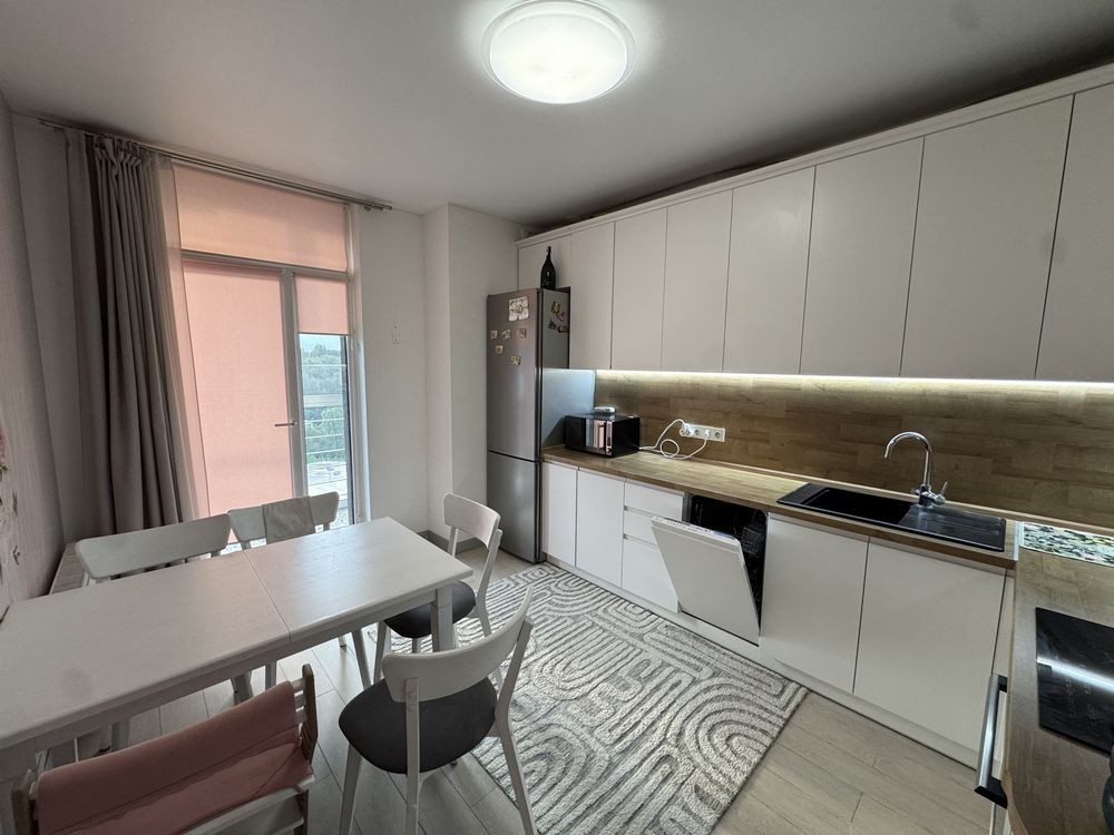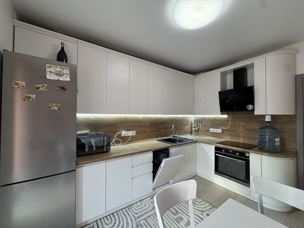 – Простора кухня з обіднім столом, меблі на доводчиках, вбудована духова шафа, індукційна варильна поверхня, витяжка, LED-підсвітка фартуха, холодильник, мікрохвильова піч