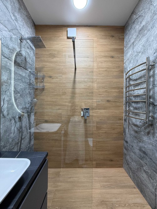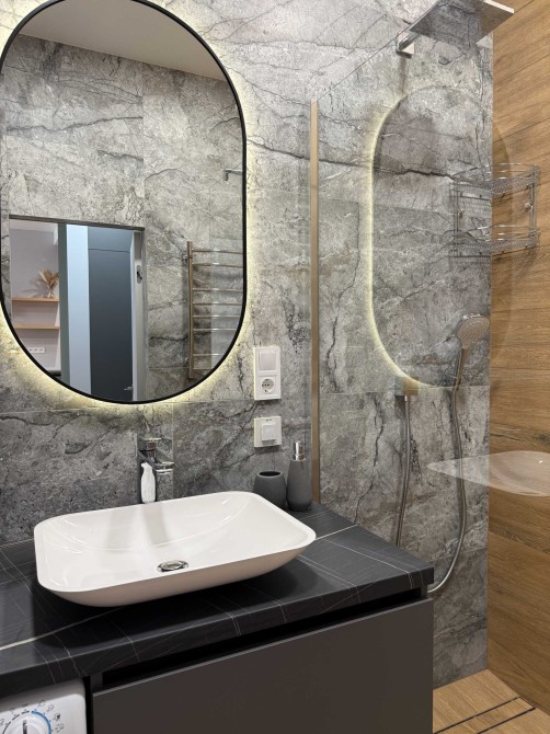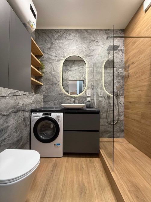 Техніка: бойлер, пральна та сушильна машини 2в1, вбудована духова шафа, вбудована мікрохвильова піч, індукційна варильна поверхня, вбудований холодильник, телевізор, кондиціонери (є можливість встановити систему очистки питної води за потреби)
