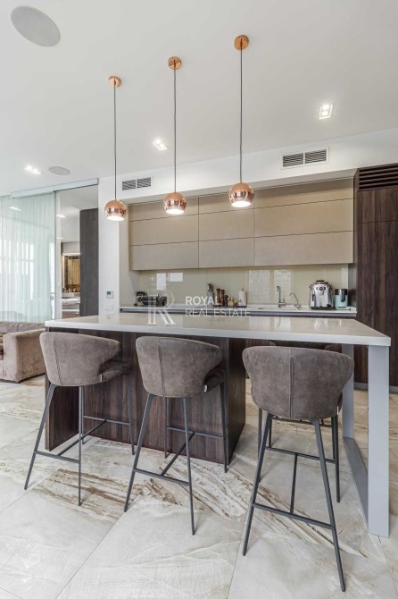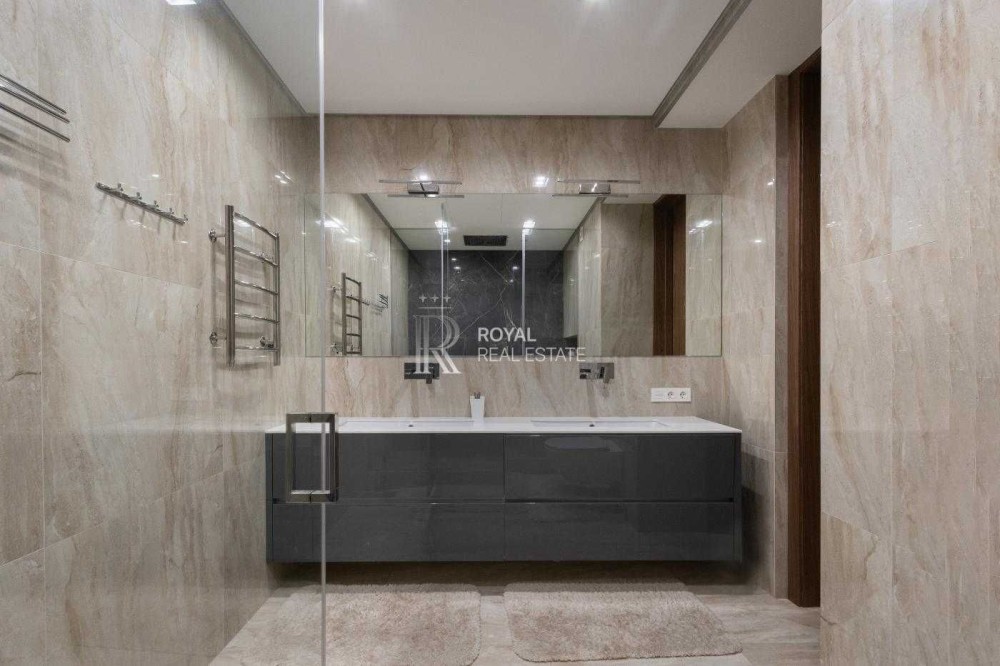 Загальна площа 120м.,кв., простора кухня-вітальня, майстер-спальня з гардеробною та санвузлом з душем та джакузі з панорамними вікнами, дитяча кімната, гостьовий санвузол, дві гардеробні, пральна кімната.