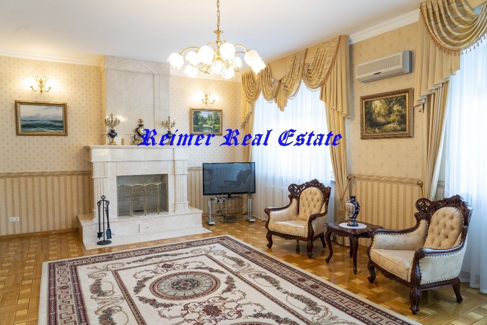 На першому – вітальня з каміном із рожевого італійського мармуру,