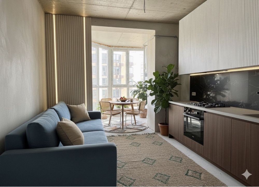 об’єднати одну з кімнат і створити простору кухню-вітальню, залишивши дві окремі житлові кімнати для сну, роботи чи дитячих.