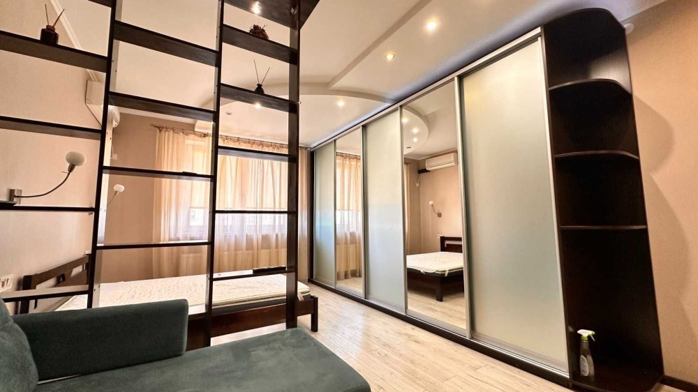 Кімната: 20 м2 розділена на зону спальні і гостьову. Встановлено двоспальне ліжко, розсувний диван, вбудована шафа-купе, телевізор.