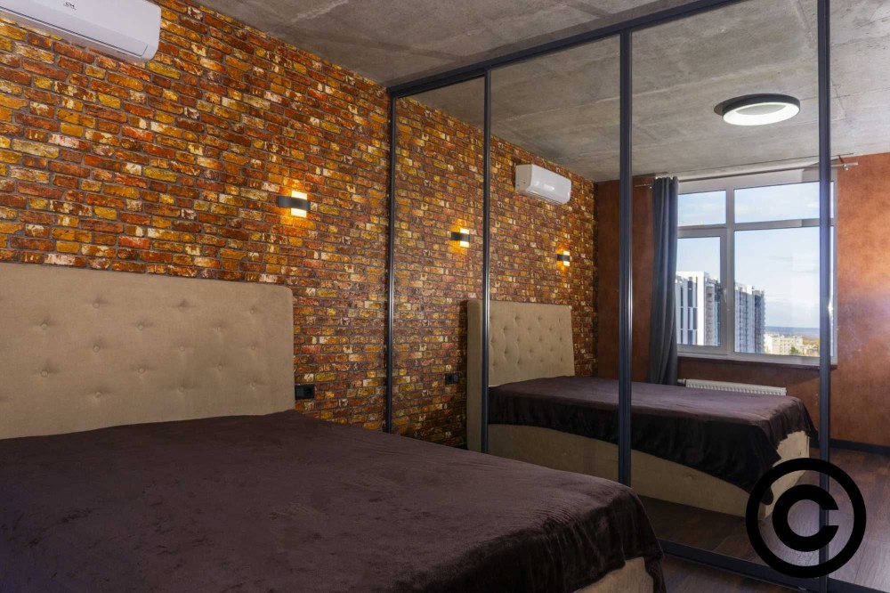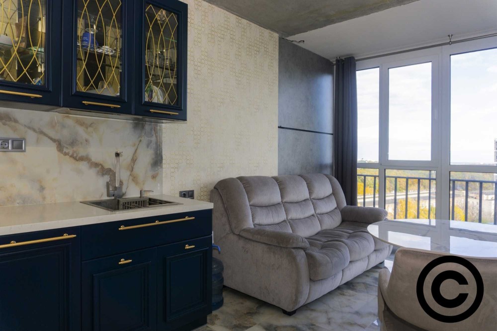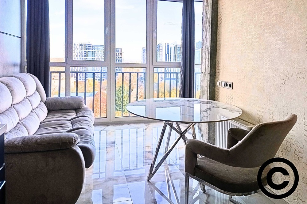 Квартира розташована на 22-му поверсі 26-поверхового будинку, що відкриває неперевершену панораму на Дніпро та правий берег Києва.