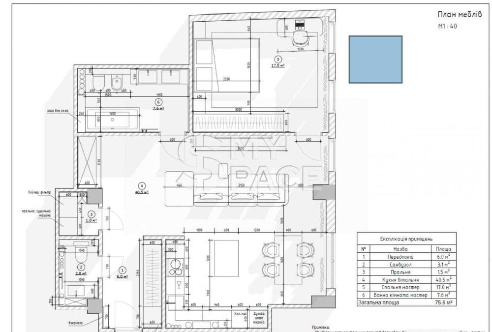 Кухня - вітальня 41,2 м2 (можна відгородити кімнату);
