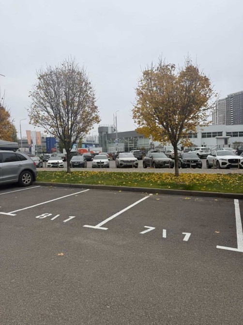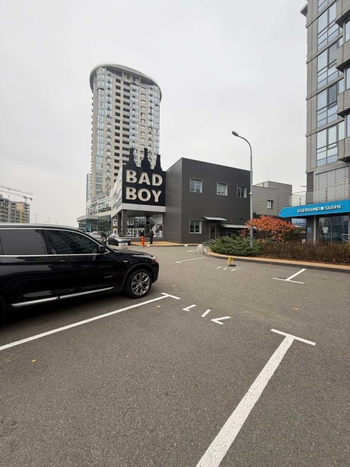Просторе паркомісце під шлагбаумом, поруч з магазином Bad Boy та зоомагазином.