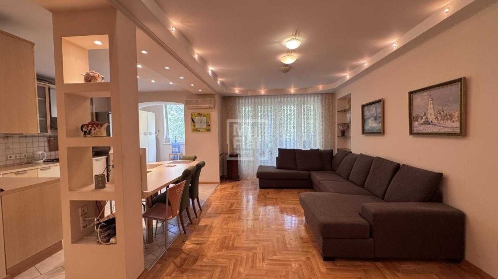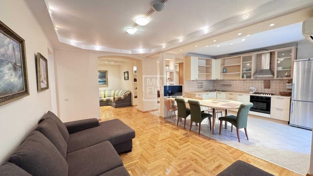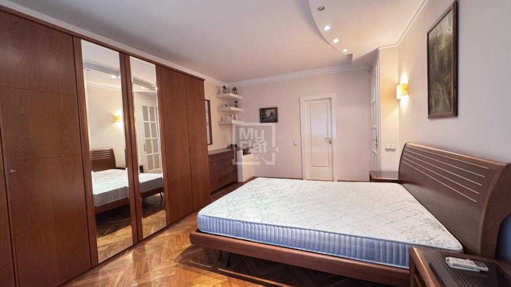Простора 2-стороння квартира в тихому місці Верхнього Печерську, загальна площа – 102 кв.м, розташована на 2 поверсі 10-поверхового цегляного будинку. В квартирі виконаний ремонт: дубовий паркет, кахель, кондиціонер, склопакети, 2 с/в, балкон засклений.