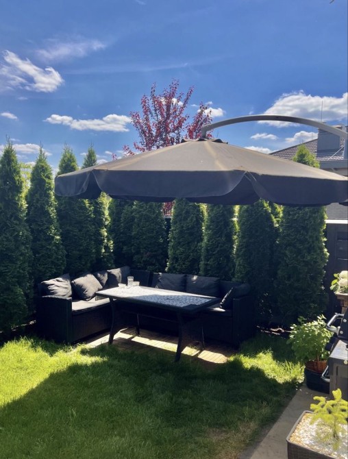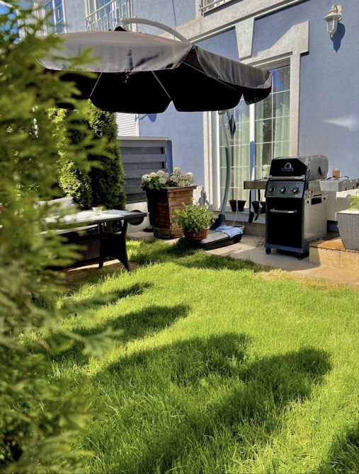 Ділянка облаштована сучасними садовими меблями, квіти, газон, посаджені дерева по периметру. Є власний паркінг!