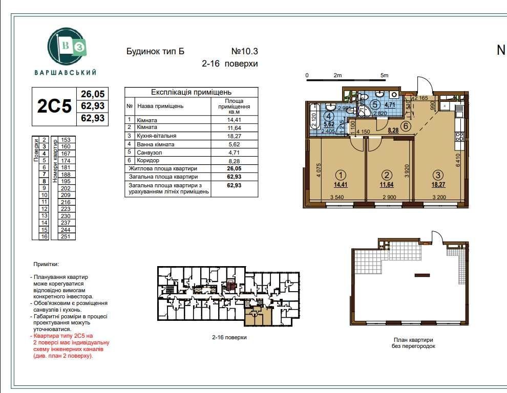 - загальна площа 62.93 м2, житлова 26.05 м2, кухня 18.27 м2