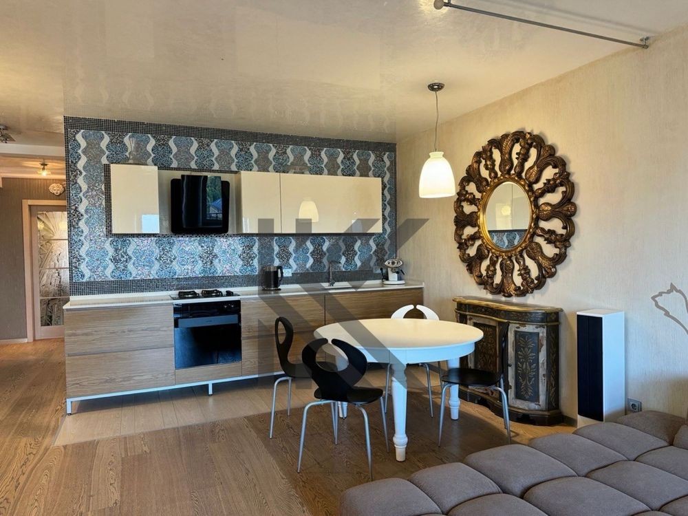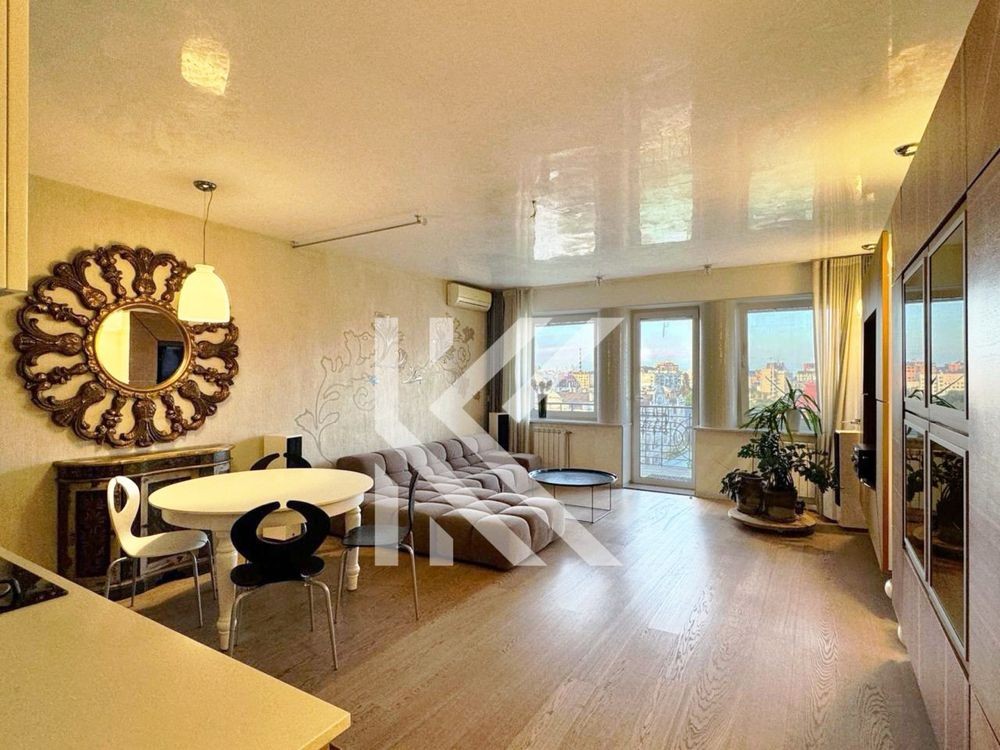Велика вітальня, в якій розташувалася зручна кухня, обідній стіл, диван, шафи та телевізор. Видовий балкон — 8 м², з панорамою Подолу та Оболоні.
