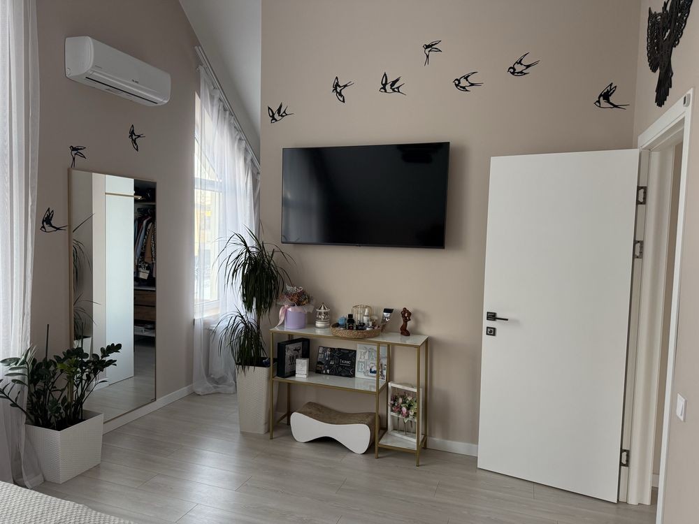 В майстер спальні є кондиціонер, ліжко 180*200, тумби , ортопедичний матрац , дзеркало велике , гардеробна з достатньою кількістю поличок.