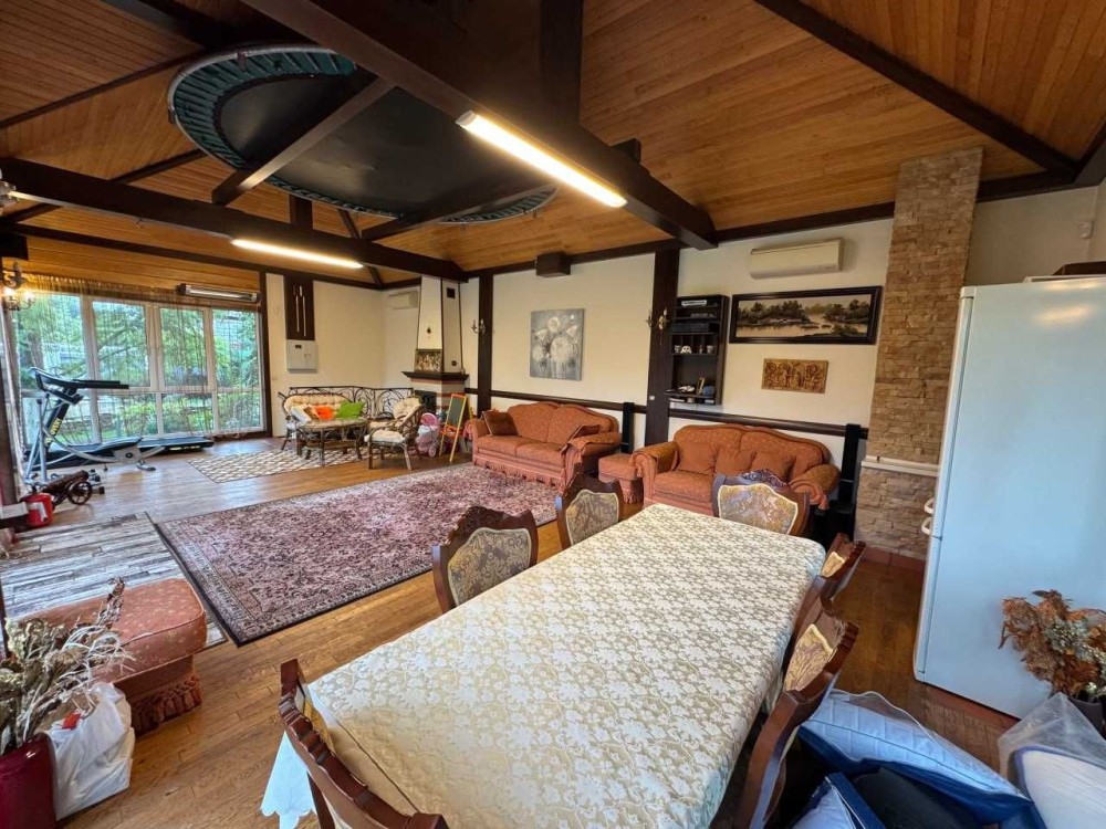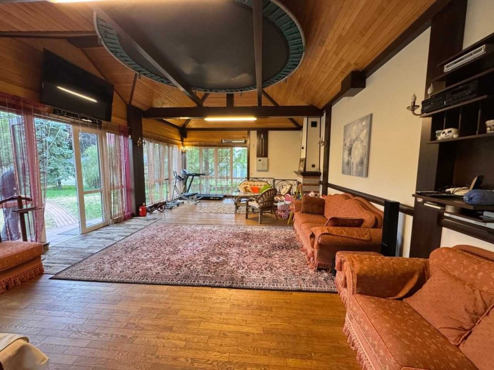 Перший поверх з вікнами в підлогу, їдальня + кухонна зона, 2 каміни, зона відпочинку біля каміна, зона для занять спортом + тренажери, батут для дітей.