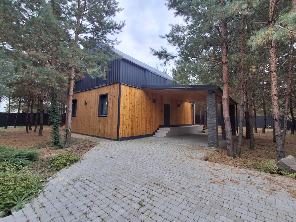 Будинок розташований у тихій зеленій місцевості передмістя Києва, всього за 1,5 км від каскаду озер села Бобриця. Територія облагороджена та оточена збереженими соснами