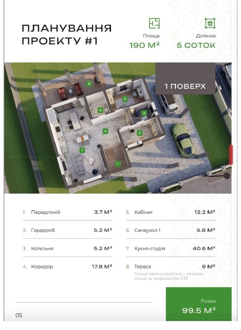 Планування: 1 поверх - хол, простора кухня, вітальня з виходом на терасу, спальня, сан.вузол, котельня.