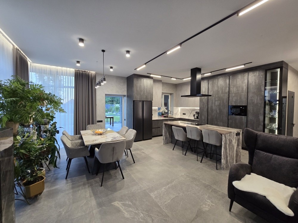 В ремонт входить кухня, сантехніка в санвузлах, вбудовані шафи , барбекю, камін , тепловий насос , плитка в санвузлах, в кімнатах чи покраска чи декоративна штукатурка, освітлення, штори, кондиціонери на 2му поверсі., на підлозі плитка на першому поверсі , в кімнатах ламінат чи дошка. Без м'яких меблів.