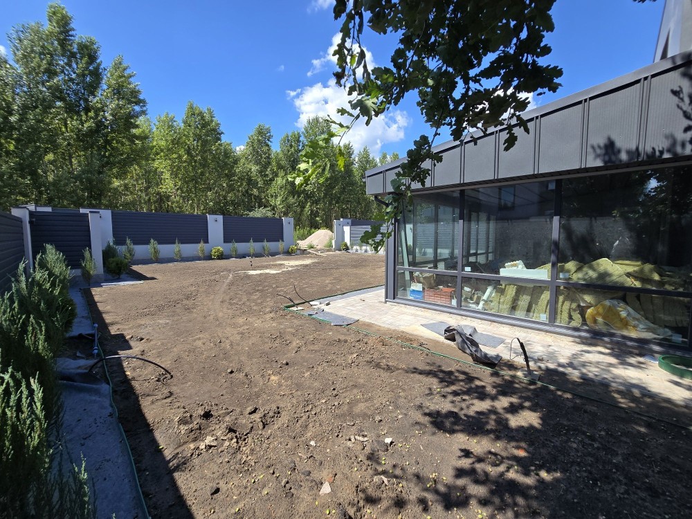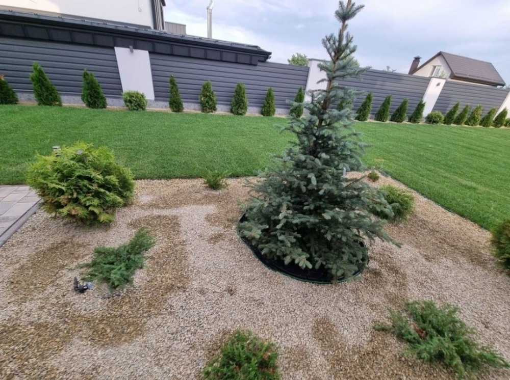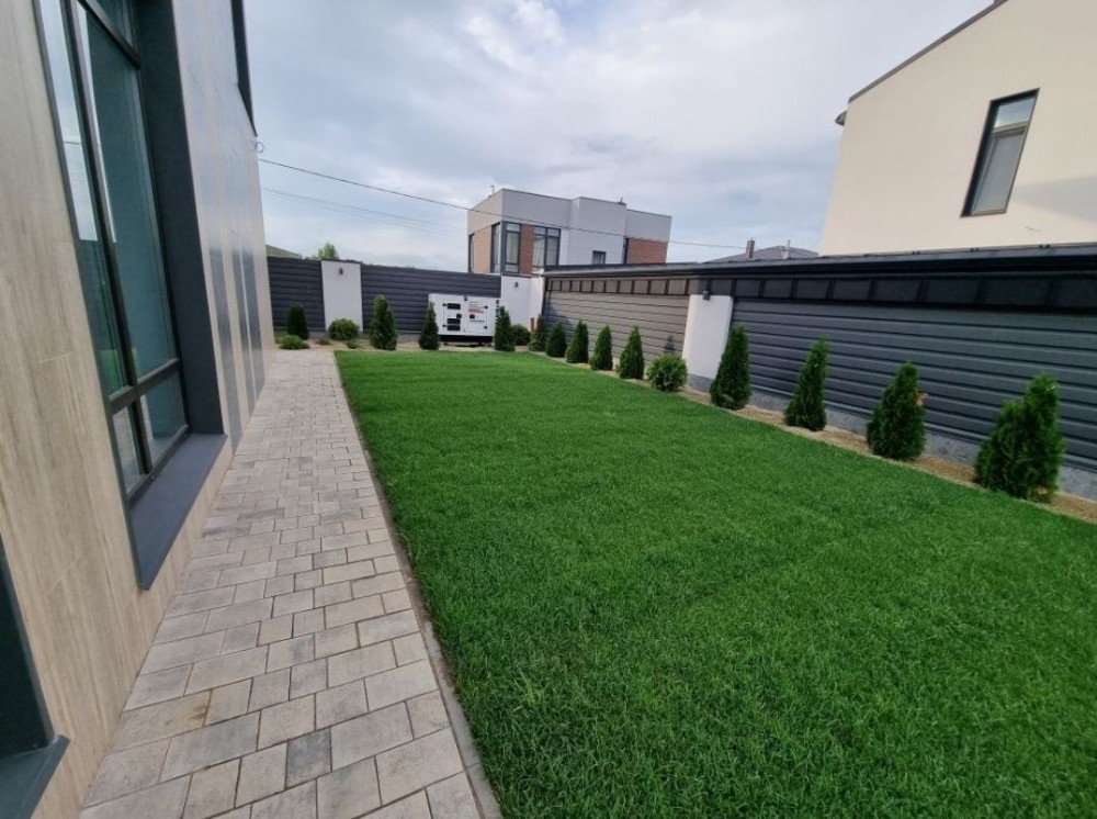 Ділянка з озелененням, тротуарна плитка, автополив, барбекю зона.