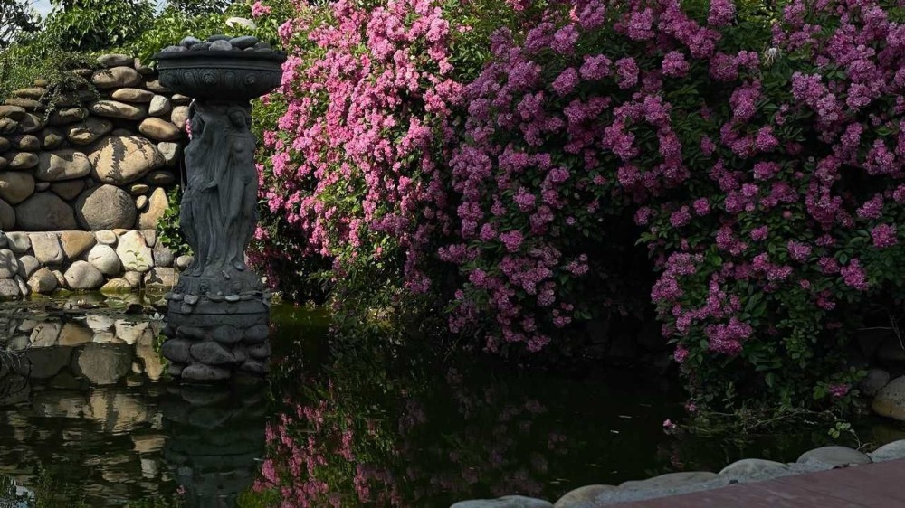 - Декоративна водойма: відкритий басейн/ставок з рибами, оздоблений каменем та рослинами.