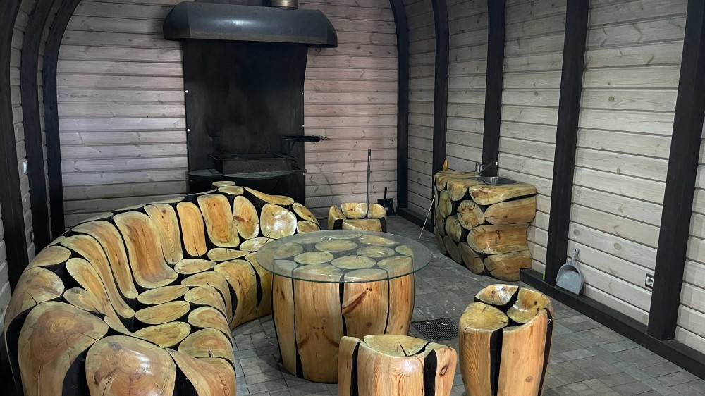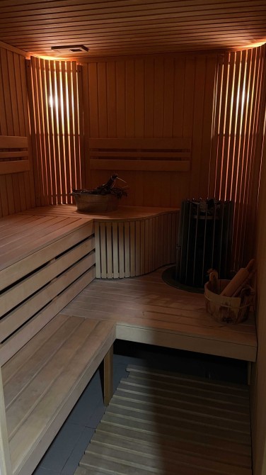 На території розміщена прибудова площею 127 м² з сауною, каміном, соляною кімнатою, BBQ зоною та зоною відпочинку, а також опалюваний гараж на 2 авто і гостьова парковка.