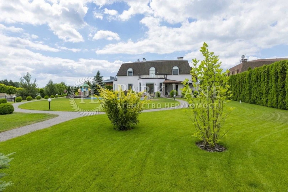 Земельна ділянка 24 сотки, кутова, газон, автополив, багато хвойних насаджень, відкритий басейн з підігрівом та проти-током. Власний вихід на р.Дніпро, свій пичал, будинок для охорони