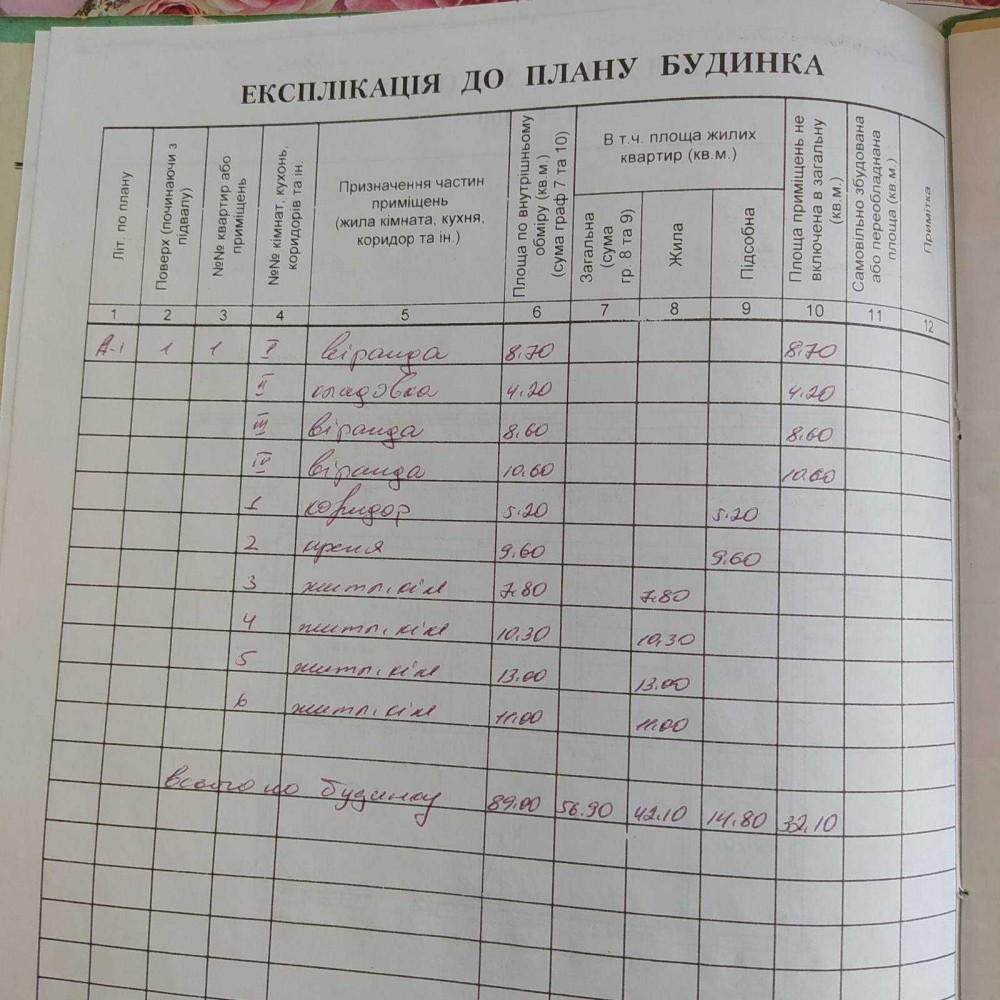 Має 3 виходи, 3 веранди, 5 кімнати, кухню і комору.