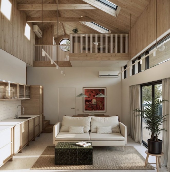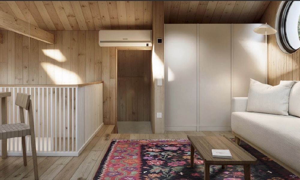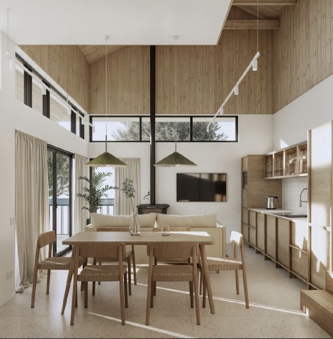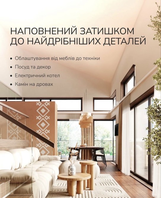 В комплектацію входить повний дизайнерський ремонт та оздоблення (камін на дровах, опалення, сантехніка, світло, меблі, текстиль, декор, посуд, побутове приладдя, техніка)