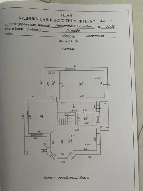 Продається недобудований двоповерховий будинок в Баришівці за адресою вулиця Одеська 1 - Б. Будинок знаходиться на земельній ділянці в 10 соток. Земельна ділянка приватизована, має прямокутну форму 25 на 40 м, майже горизонтально рівна, різниця по діагоналі складає не більше 30 см по висоті. Будинок має монолітний армований ленточный фундамент. При армуванні фундаменту та стін використовувалась арматура 1,2 см. Стіни виконані з пеностирольних блоків де всередину вставлена арматура і залита бетоном. Перекриття між першим та другим поверхом та горищем виконано з дерев'яних балок 20 на 30см. Будинок покритий металочерепицею. стоять металопластикові вікна та технічні вхідні двері. На земельній ділянці знаходиться приватна водяна скважина та заведена вода в будинок. Будинок підключений до зовнішнього електропостачання з величиною прогнозованої приєднаної потужності 7 кВт напруга приєднання 380 B. Зовнішній розмір будинку по ширині складає 11,5 м, по довжині 13,4 м. Жила площа першого поверху складає 127,29 м². З них кухня складає 32,63 м², зала складає 36,47 м², кімната складає 23,13 м², туалет складає 11,52 м² 52, коридор займає 23,54 м². Висота стелі 3 м. Другий поверх мансанровий, де по площі підлоги має таку саму квадратуру 127,29 м², як і перший поверх, але в кожній висота однієї зовнішньої стіни складає 1,75 м за рахунок нахилу даху. Розташування кімнат ідентичне до першого поверху. Висота стелі 2,75 м. За рахунок пеностирольного покриття стін сам будинок дуже є енергозберігаючим і потребуватиме невеликі витрати на обігрів. Oбігрів будинку планувався електричний, так як будинок має низьку втрату тепла, але і можливі інші варіанти обігріву, такі як газ або комбінації дров'яного каміну та електрообігріву. Газопровід іде по вулиці. За рахунок великих вікон будинок отримує достатньо багато сонця і кімнати всі світлі. Великі кімнати та коридори дають багато креативного простору, щоб створити житло яке підходить власне для вас. Наявні документи на земельну ділянку та будинок: - Державний акт на право власності на земельну ділянку виданий на власника будинку. - Будівельний паспорт на забудову земельної ділянки. В двох екземплярах. Виданий на власника будинку. - Проект на забудову земельної ділянки в двох екземплярах. Виданий на власника будинку. - Проект зовнішнього електропостачання та технічне рішення видане на власника будинку. Ціна будинку 30500 євро. Можливий розумний торг. Контактні дані WhatsApp: +4917630793718 Email: skorba-oleg@ukr.net Oleg
