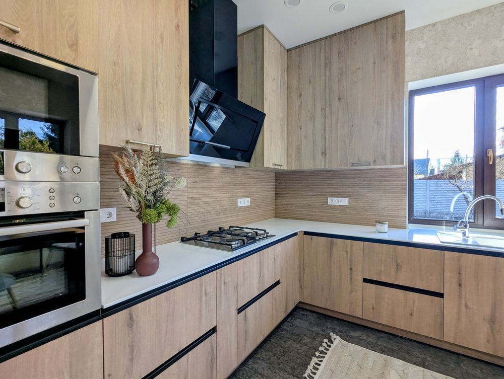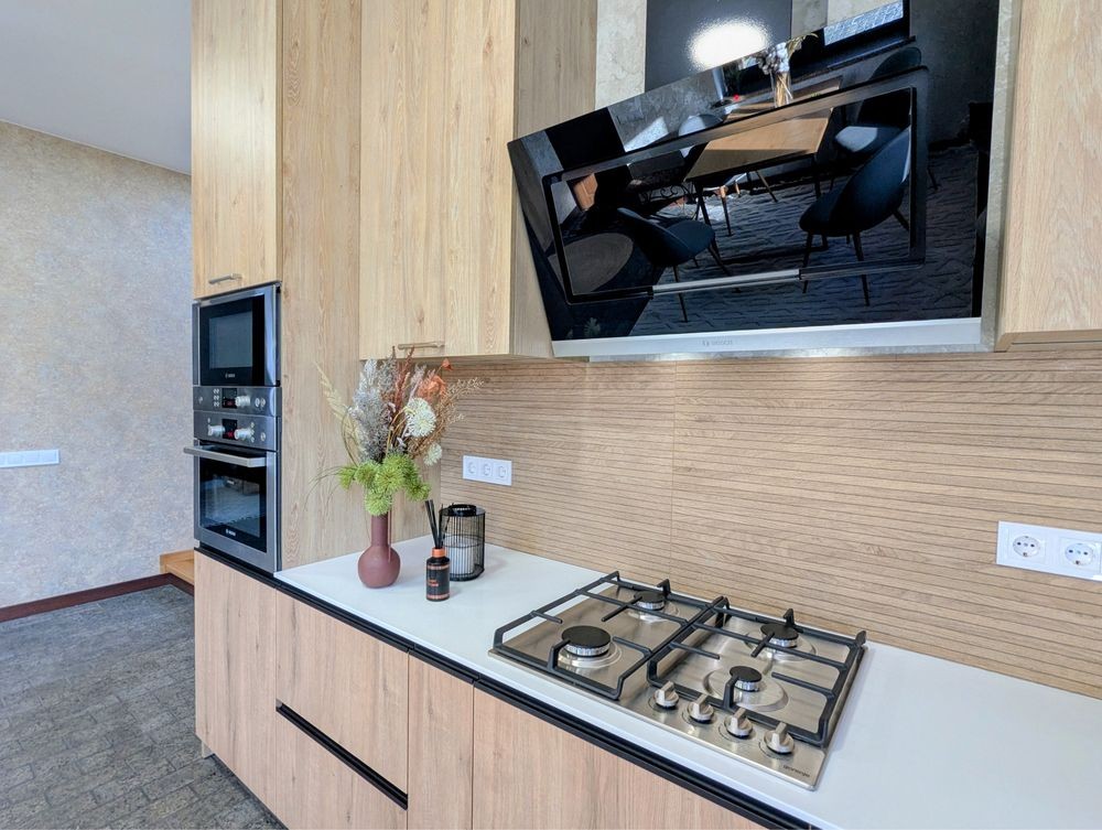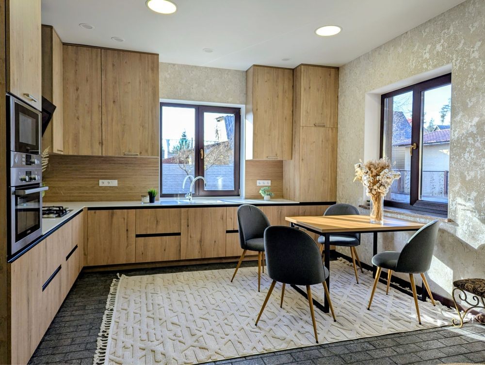 Пропонується просторий і світлий будинок площею 180 м² з повністю новим сучасним ремонтом та технікою Bosch. Раціональне та зручне планування: велика кухня-вітальня, просторий зал, дві окремі спальні та два санвузли.