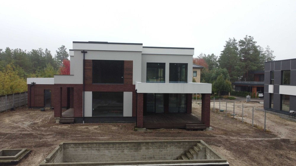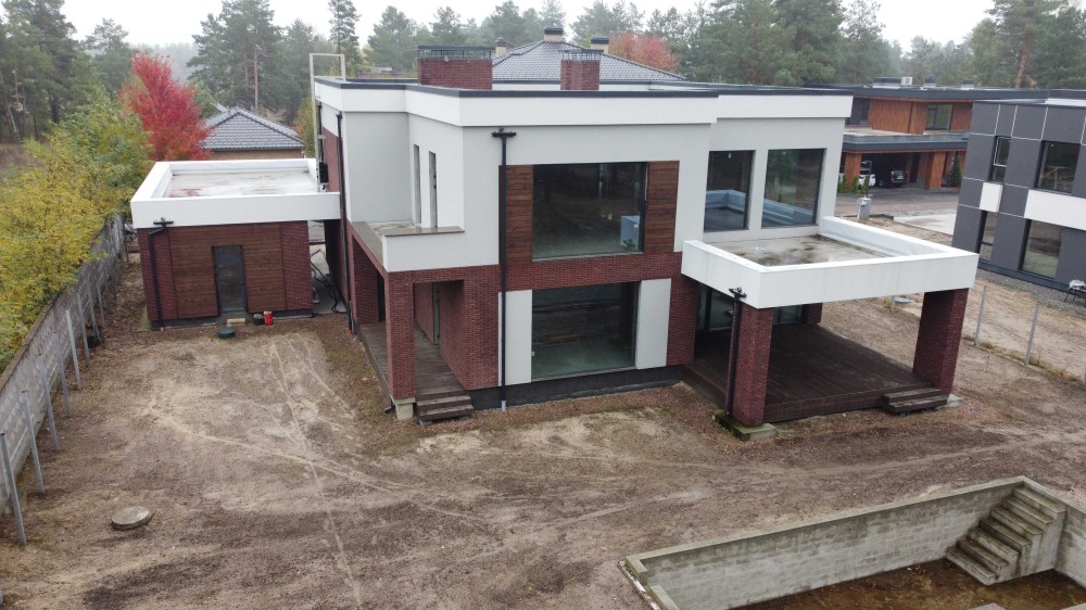 При будівництві будинку використовувалися якісні матеріали (бельгійська цегла ручного формування, гранітні фасади та парапети, сибірська модрина, алюміній). Панорамні вікна виготовлені з алюмінієвого профілю, дах -мембрана "Siko" (вир-во Швейцарія).