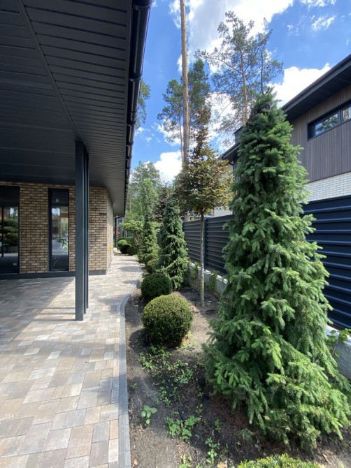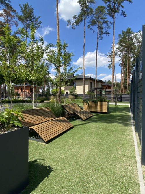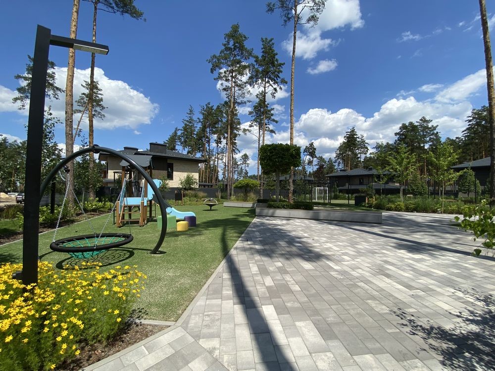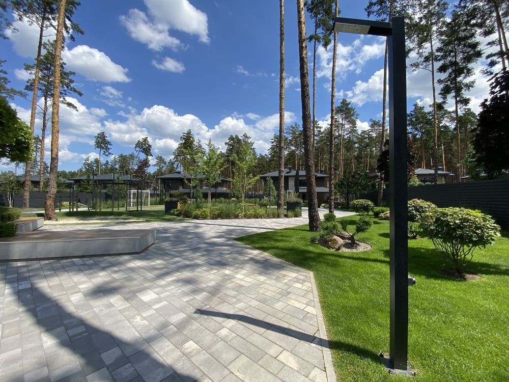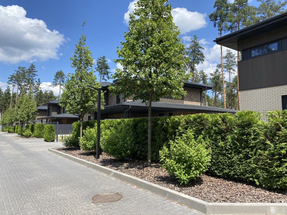 Унікальний дизайн будинків органічно поєднався з природним ландшафтом соснового лісу. Прості форми та фасади, оздоблені натуральним деревом та клінкерною плиткою, вдало підкреслюють атмосферу лісового затишку.