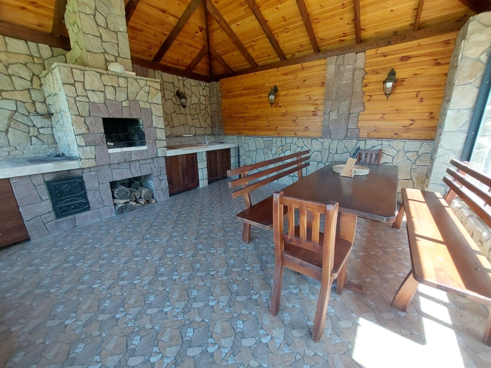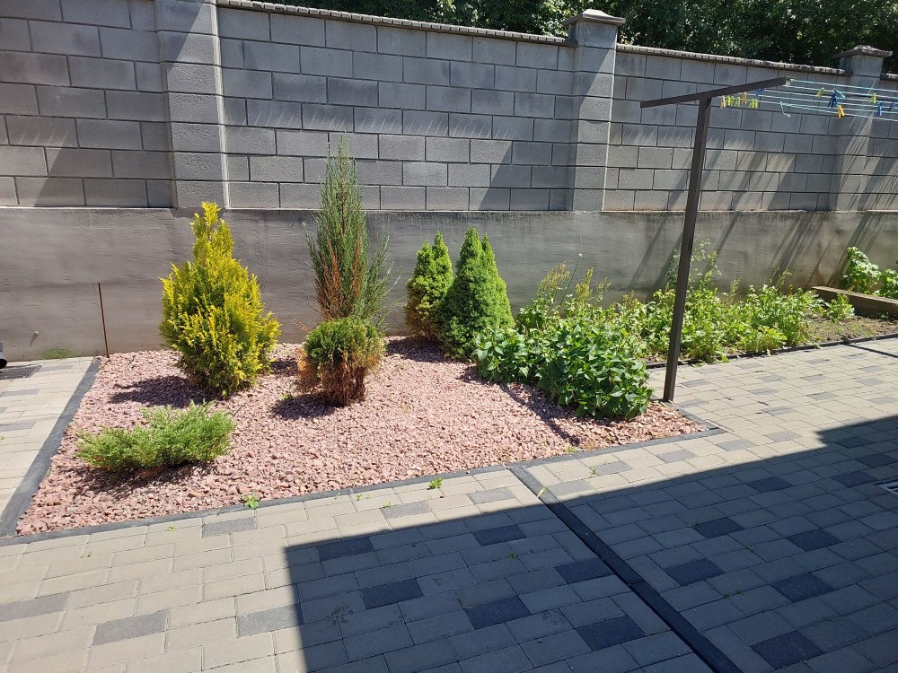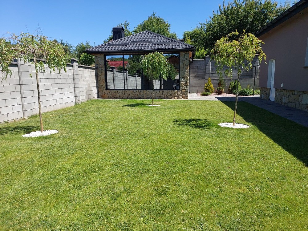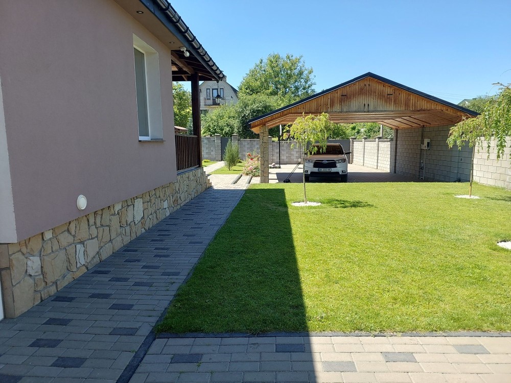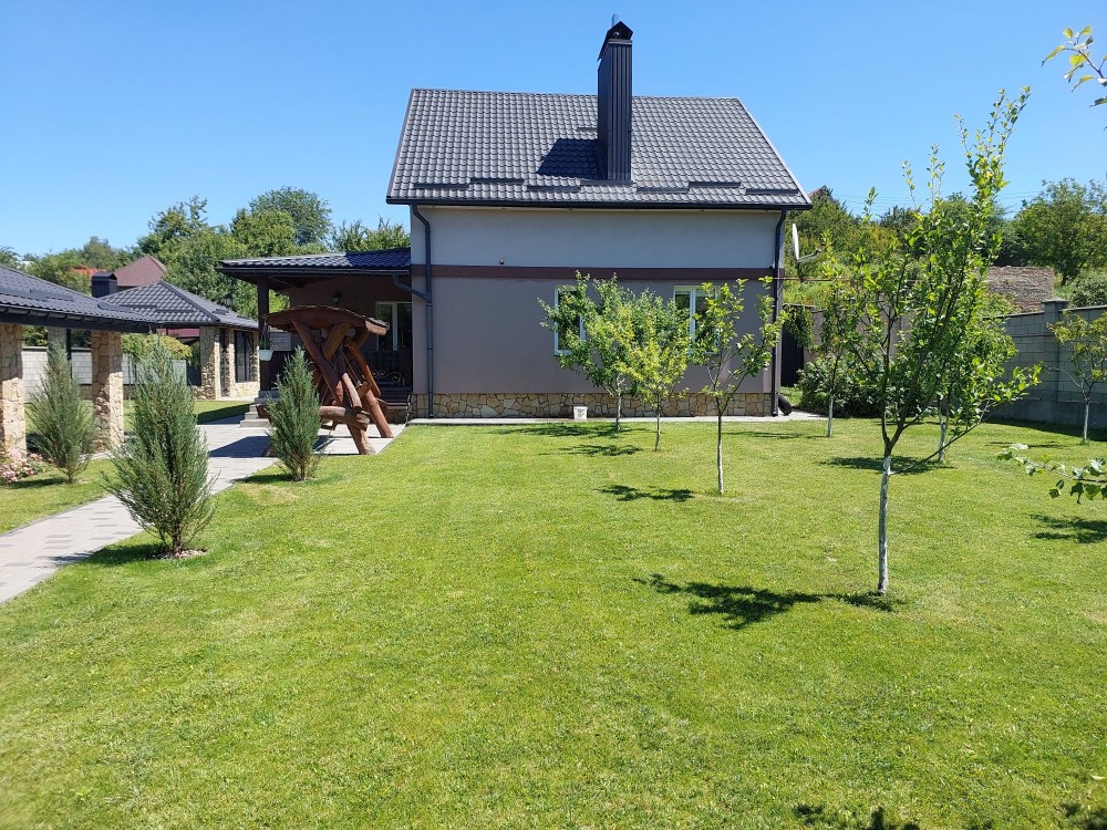 - двір: навіс 7×9 м на два автомобілі, місце для зарядки елетромобіля, садова зона (плодові дерева + можливість посадки городини), декоративна зона, зона відпочинку (мангал 30 кв.м., засклений, профіль алюміній, розсувні вікна), господарська зона (сарай для зберігання садового інструменту і т.д), вольєр для вашого улюбленця 3×3 м.;