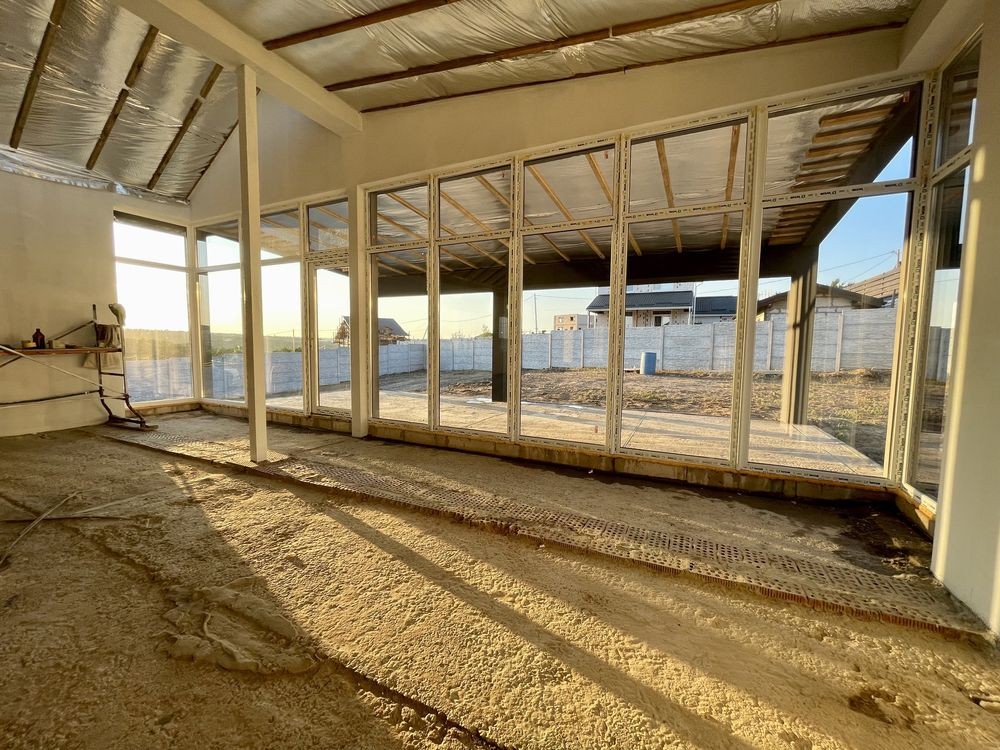 На даху фальцева покрівля 0,5 мм, з утепленням мінватою 250 мм, прихована водостічна система.