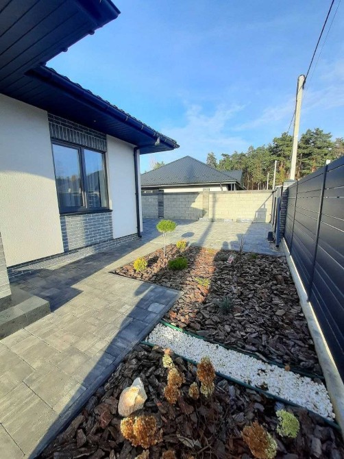 Навколо будинку ландшафтний дизайн з рокарієм і плиткою.