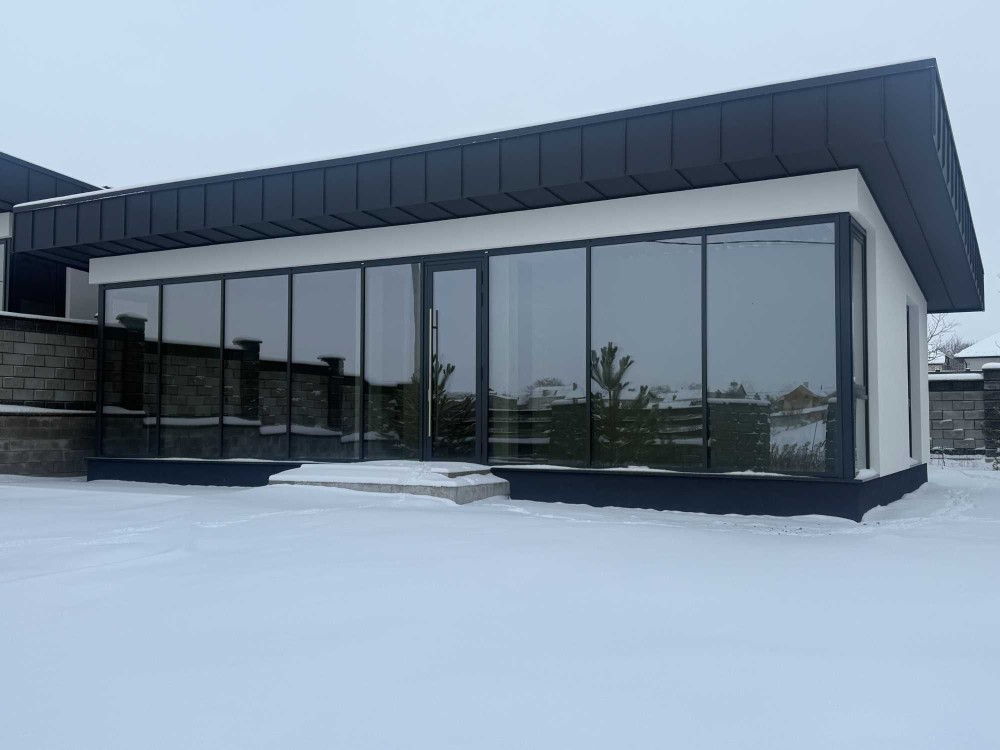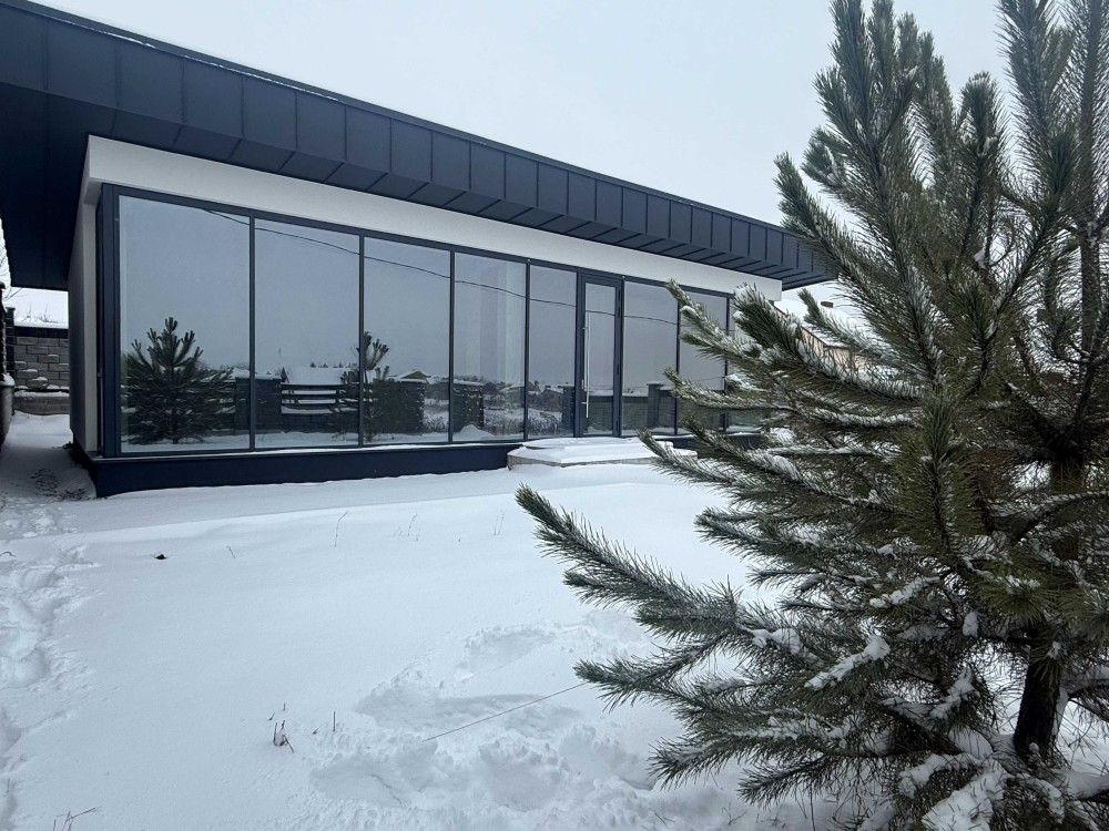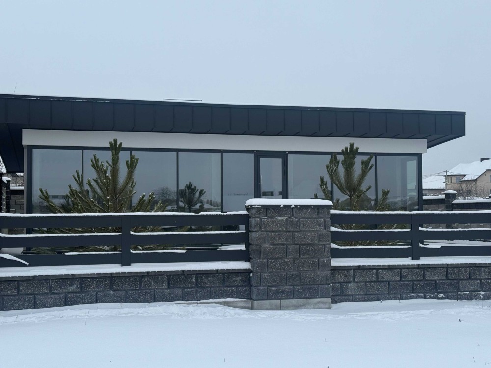 Будинок з фальцевим дахом та панорамним заскленням 75м² та 4со є-Оселя
