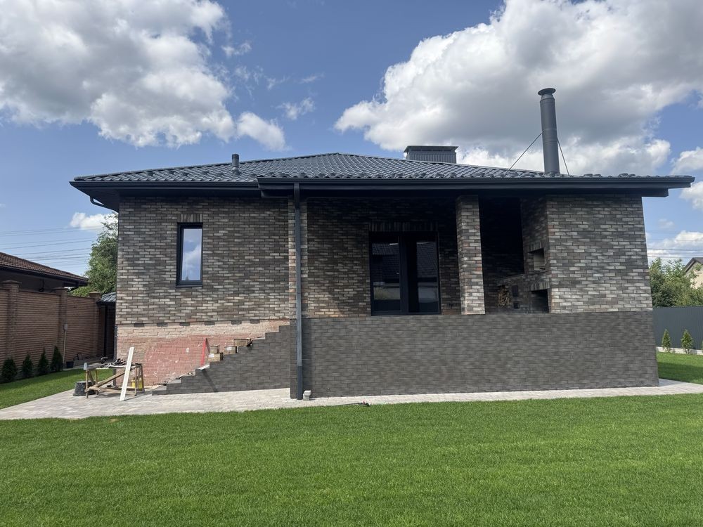 Стрічковий фундамент , утеплений та облицьований плиткою , стіни будинку 500 см (цегла 250 мм, утеплені перлітом 120 мм та облицьовані клінкерною плиткою 120 мм)
