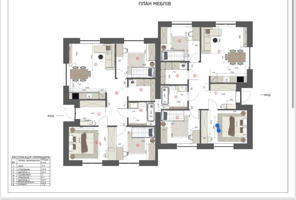 Площа будинку 75.5 кв.м: три кімнати, кухня-вітальня 20 кв.м, с/в, гардеробна.