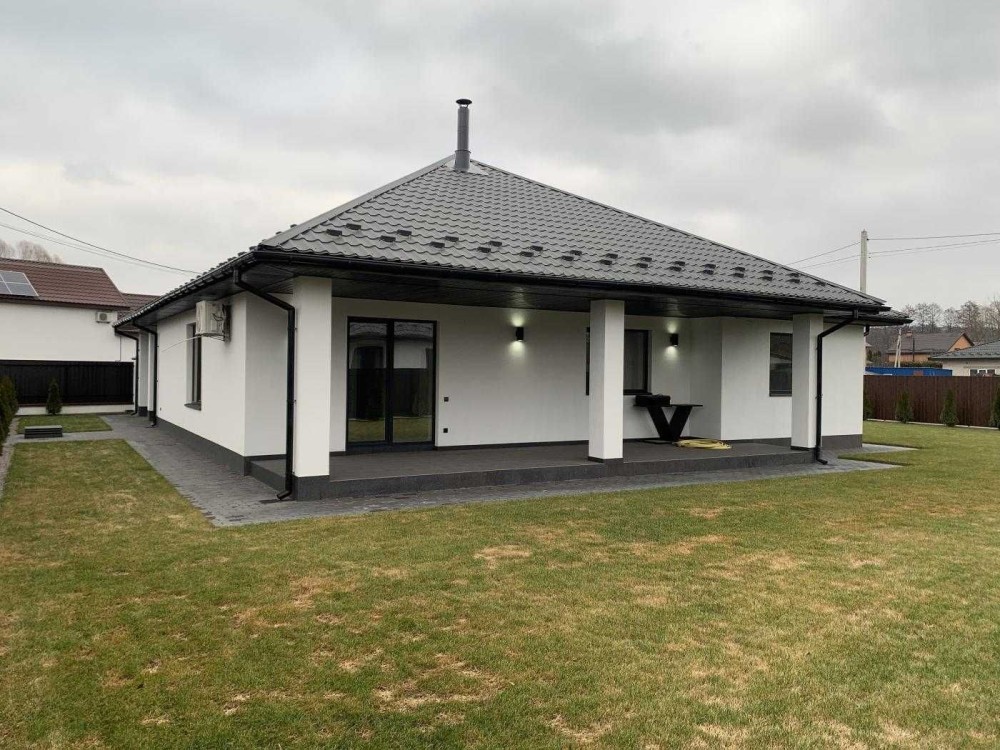 Планування: вхідна група з місцем під шафу, котельня, дві дитячі спальні та господарська з гардеробом, два санвузли, простора кухня вітальня з виходом на терасу та каміном.