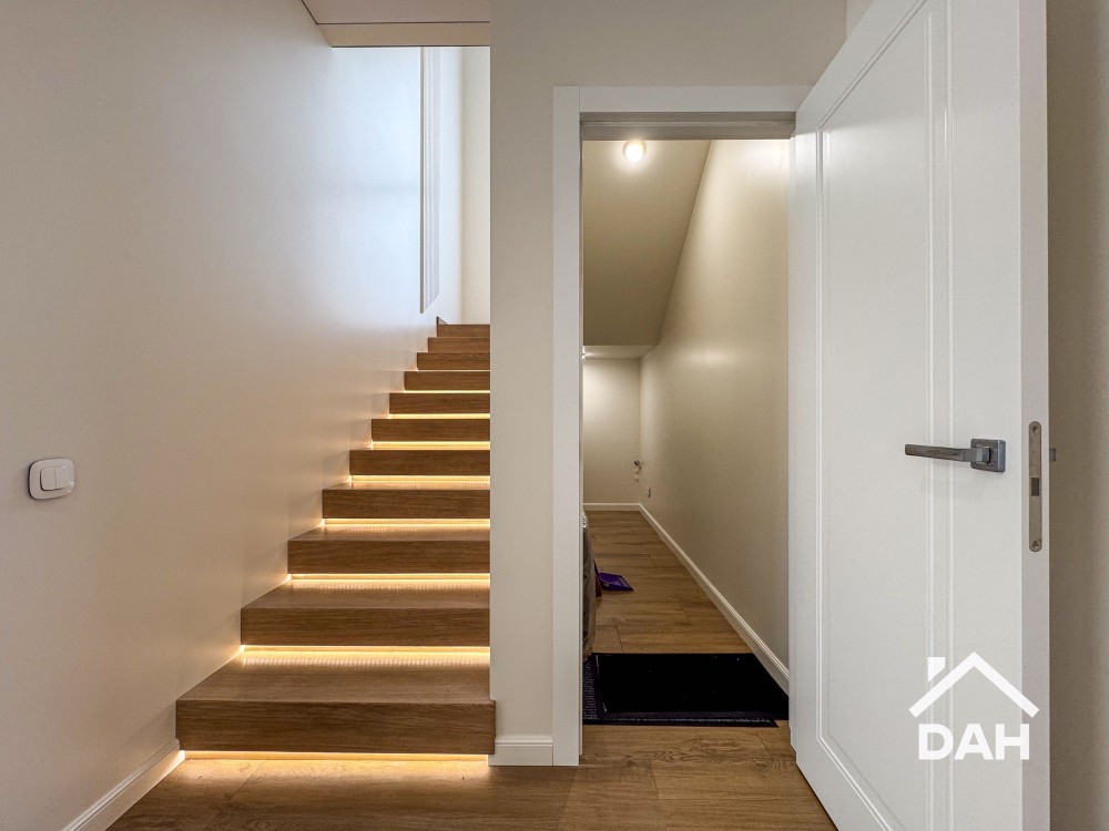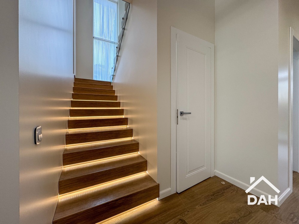 • Підлога — плитка та ламінат, сходи — ясень.