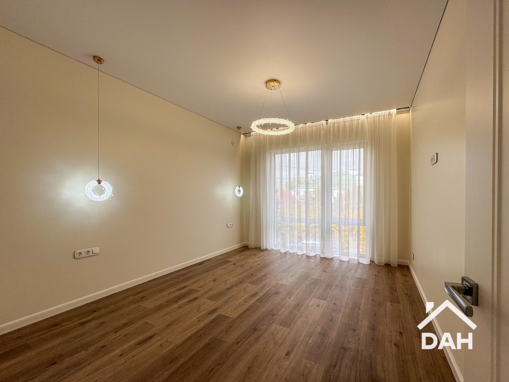 • Натяжна стеля, світильники та штори.