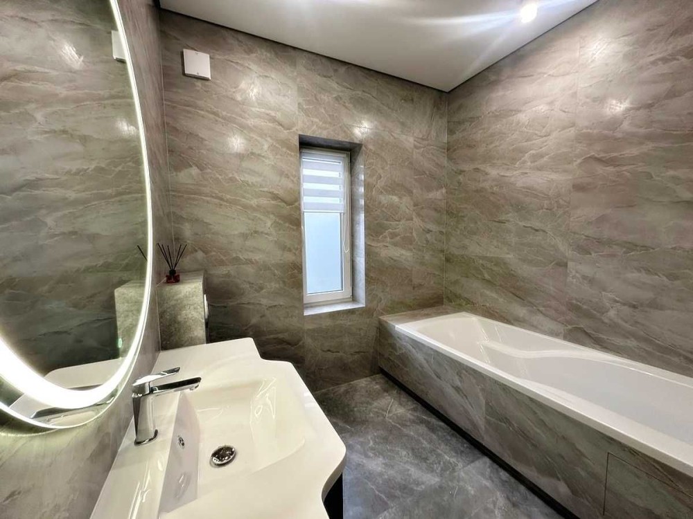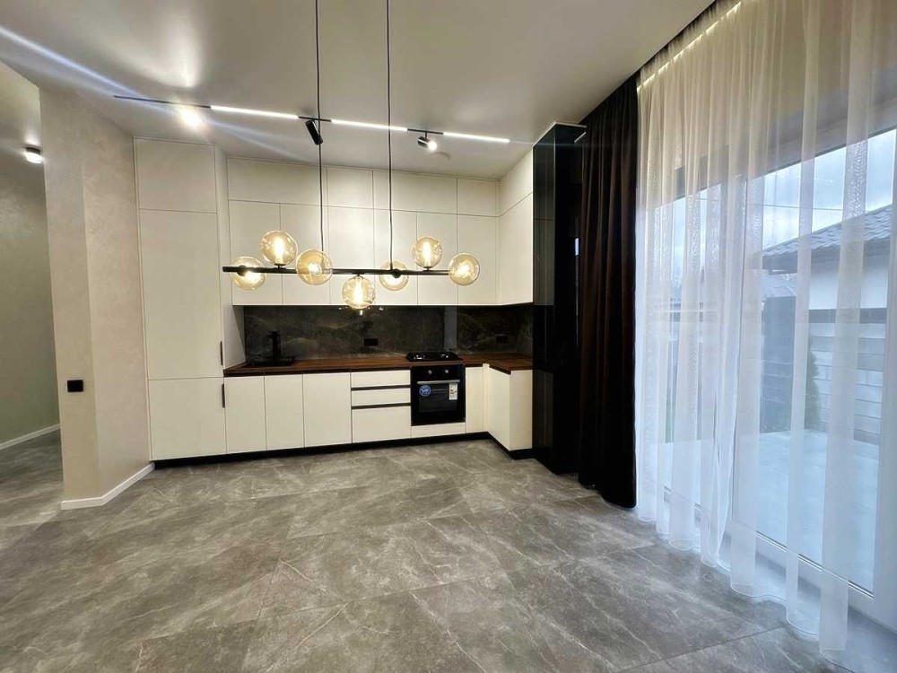 У просторій кухні-вітальні сучасна кухня з вбудованою технікою, затишна зона відпочинку з диваном. Кондиціонери у спальнях та кухні, тепла підлога по всьому будинку.