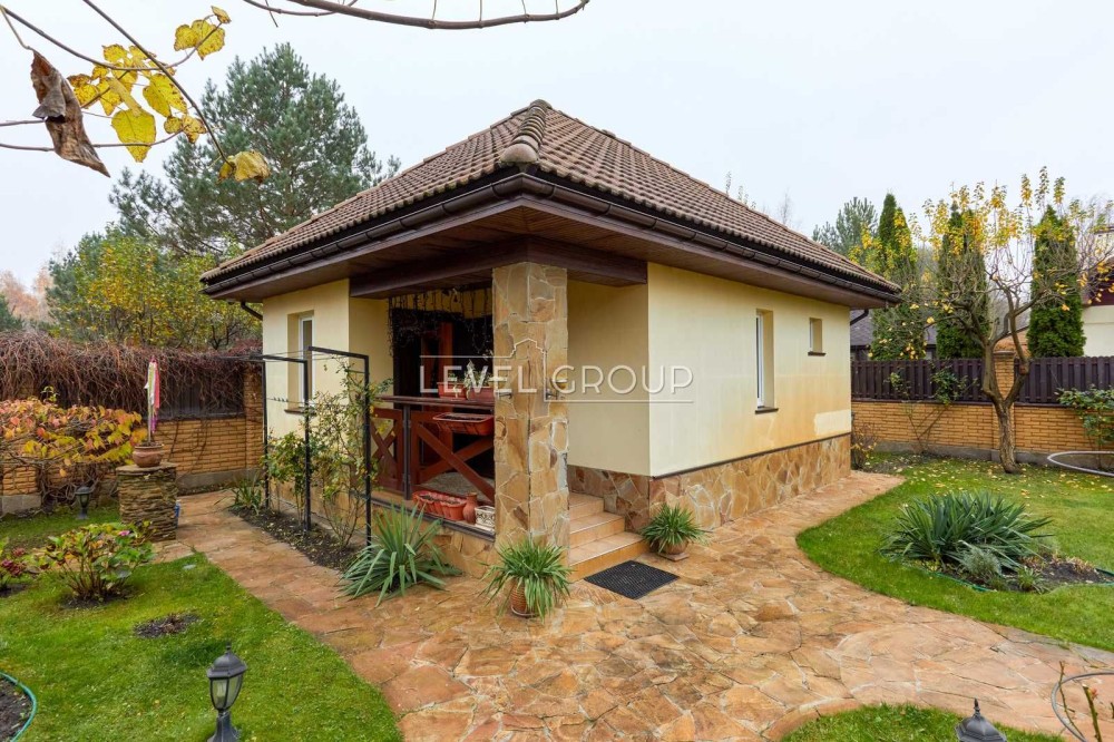 На території передбачено гараж, додаткове паркомісце під навісом, альтанку з зоною барбекю та баню. Простір продуманий для сімейного відпочинку та прийому гостей.