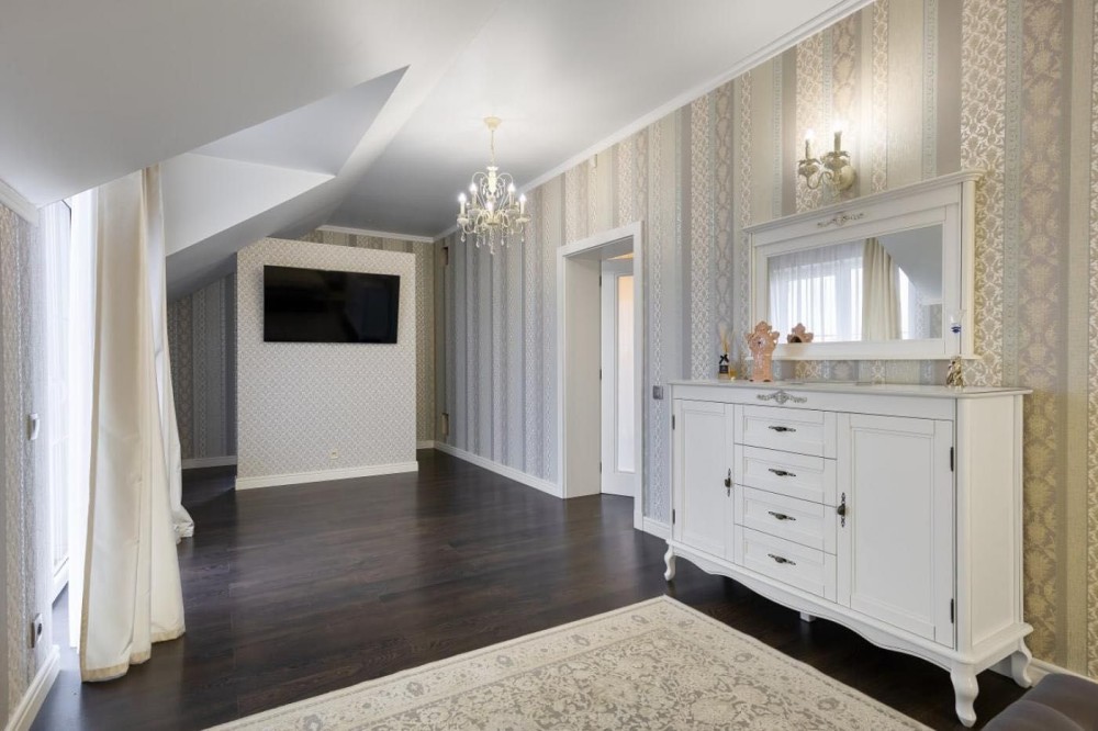 Перший поверх: одна спальна кімната, простора вітальня з каміном, кухня, санвузол, коридор, прихожа, гардеробна, кладова, сауна, душова, відпочинкова кімната.