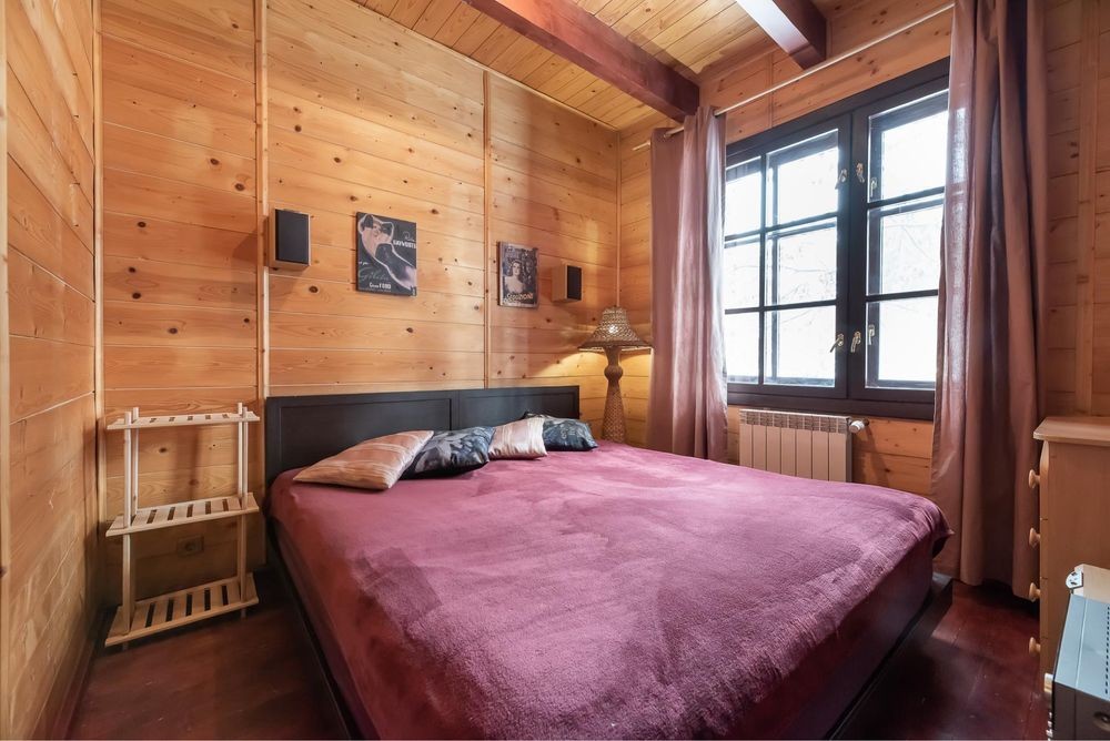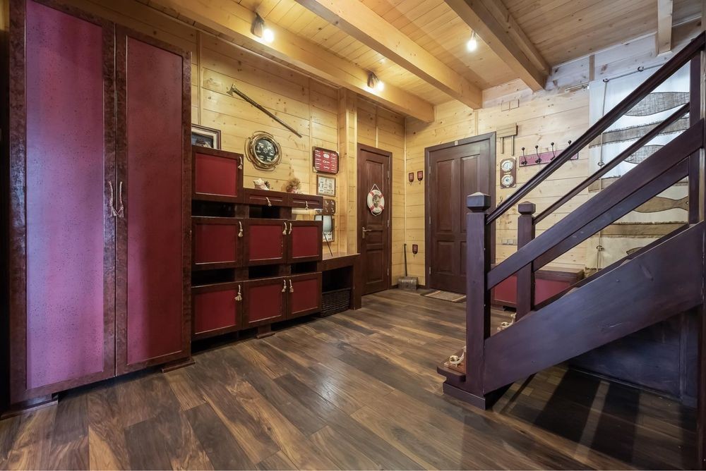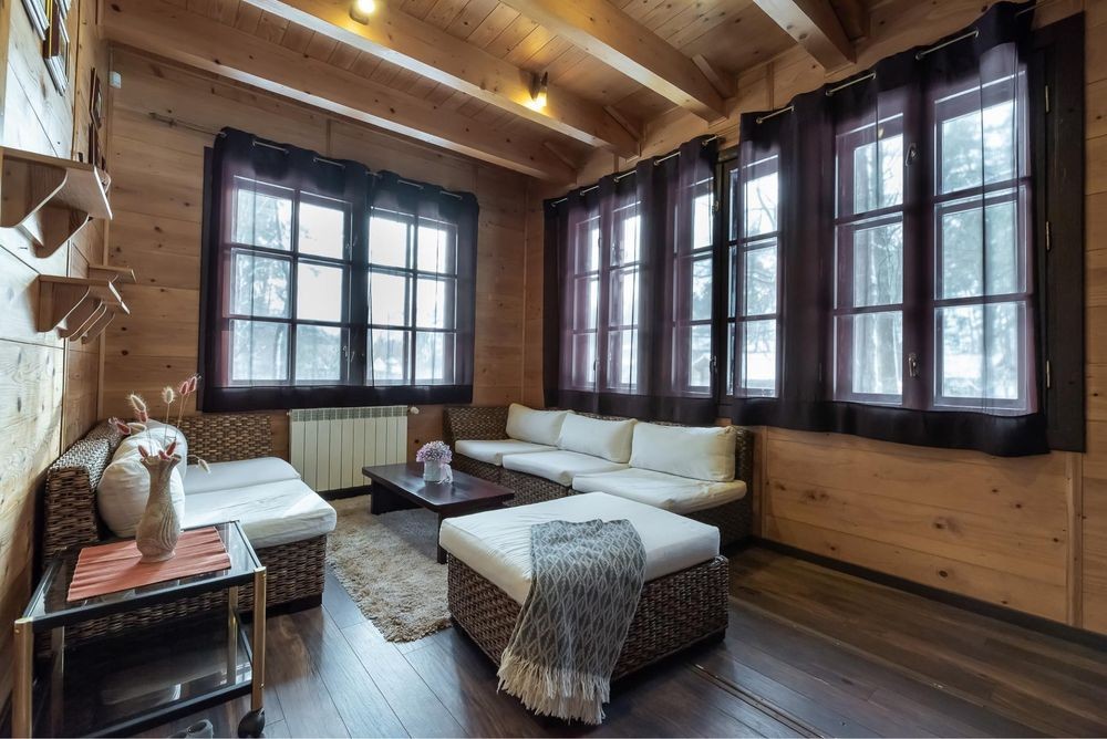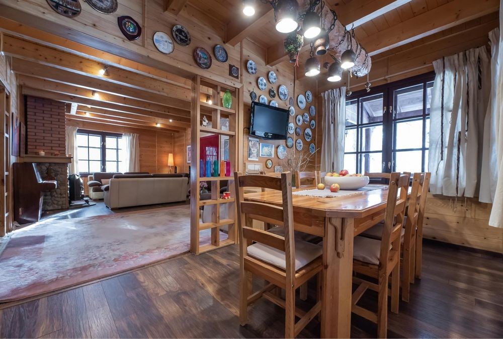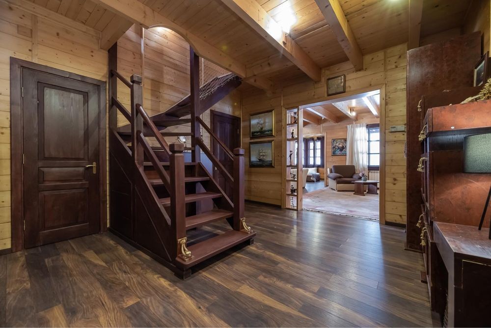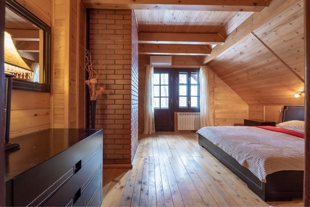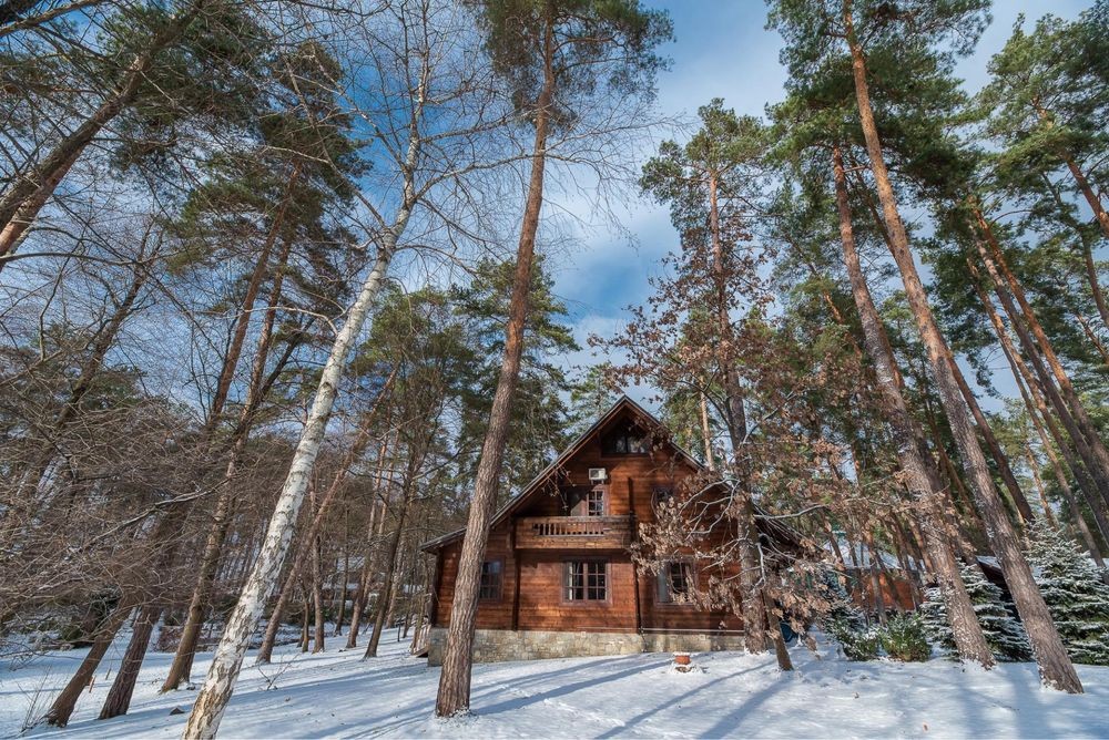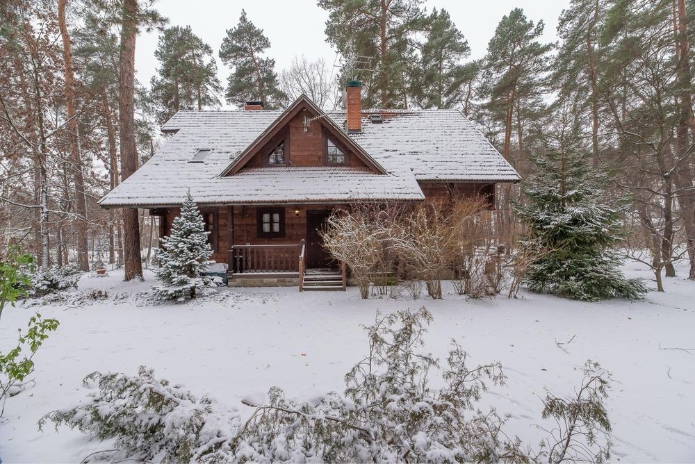 В оренду пропонується теплий будинок із карпатського зрубу серед величних сосен у закритій котеджній групі Романкова — всього 12 км від Києва.