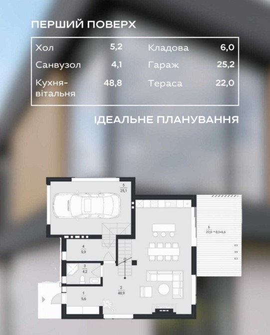 Загальна площа будинку — 170 м², житлова — 49.9 м², кухня — 48.8 м², гараж - 25.2 м²