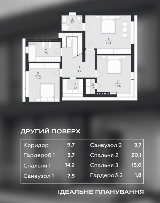 Другий поверх: три житлові кімнати, два санвузли, дві гардеробні, вихід на балкон, можливість облаштування тераси